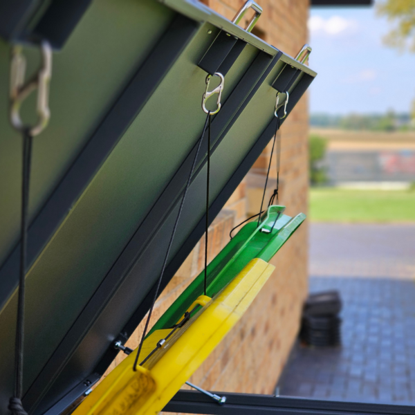 Pastogė gali talpinti tris 60, 120 arba 240 litrų talpos konteinerius. Taip pat nereikės vargti ištraukiant konteinerio kiekvieną kartą – yra integruotas viršutinis atidaromas dangtis, leidžiantis patogiai išmesti šiukšles, o specialus kabliukas su virvele automatiškai pakelia vidinio konteinerio dangtį. Pastogėje taip pat yra įrengtas automatinio dangčio nuleidimo mechanizmas bei švelnaus uždarymo slopintuvas, leidžiantis dangčiui užsidaryti beveik be garso.